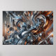 "Courants métalliques" étudie les contrastes entre les formes organiques courantes et les structures cristallines tranchantes. L'oeuvre d'art relie des éléments liquides qui rappellent le métal fondu et les surfaces réfléchissantes à des motifs angulaires complexes. Cette palette de couleurs va des huiles fraîches en argent et en bleu aux huiles chaudes en cuivre et en bronze et donne une impression de profondeur et de mouvement. La lumière et les ombres jouent un rôle central, ce qui rend la composition plus complexe et symbolise l'interaction entre le chaos et le contrôle, la nature et la technologie. L'image est captivée par sa dynamique et sa tension visuelle.