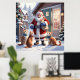 Santa Claus warmly greets a cat family at their snowy doorstep. Father, mother, and son cats wear winter coats and scarves in a realistic Pixar watercolor style
