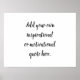 Créez Votre Propre Poster do-it-yourself Citation Inspirationnelle Moderne. Affiches imprimées ou téléchargeables numériques. Ajoutez ici votre propre citation inspirante ou motivante en utilisant la typographie moderne. Ou changez de police de caractères ou de taille. Ajoutez, supprimez ou modifiez le nombre de lignes. Texte en noir sur arrière - plan blanc ou changer à votre choix. Idéal pour les encouragements fitness moderne gym ou des citations ou versets religieux ou chrétiens inspirants. Parfait pour donner aux équipes ou aux organisations afin que tous reçoivent le même devis personnalisé. Contactez Kris Harty par l'intermédiaire de son magasin pour obtenir de l'aide avec les modifications. Step by Step Inspiration Series disponible exclusivement sur Zazzle à l'adresse zazzle.com/store/KrisHarty, conçu par le designer international Kris Harty. © 2020 Kris Harty Pas à pas Conception inspirationnelle
