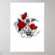 Contour, lune de croissant mécanique avec des engrenages, décoré de roses rouges avec des tiges noires spirées et feuilles sur arrière - plan blanc. Steampunk