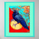 Un dessin fantaisiste d'un corbeau assis sur un grand oeuf. Peint est de couleurs sud-ouest avec des tons turquoise et des rouges audacieux. Un beau et fort design naturel. Un design artistique très décoratif. Il s'agit d'une halte-spectacle et d'un must pour les amateurs de corbeaux. J'ai peint des dizaines de corbeaux. Mon jardin est un sanctuaire faunique pour les oiseaux en général. Aucun n'est plus bienvenu et apprécié que les corbeaux et corbeaux. Il y a des coussins et des tasses à café disponibles dans ce magasin avec les mêmes images.
