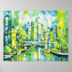 peinture cubiste unique d'une ville verdoyante avec un pont moderne au-dessus d'un canal. Les formes géométriques et les tons vifs renforcent l'atmosphère urbaine dynamique.