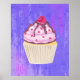 Une affiche avec l'illustration d'un cupcake délicieux. Le gel rose et les gouttelettes de chocolat. Porte-cupcake jaune et framboise sur le dessus. Yummy ! L'arrière - plan est une texture abstraite violette avec de petits coeurs parsemés autour.