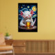 A cute, white axolotl character with pink ears and red spots smiles happily while holding a frothy mug of beer, set against a starry night sky. Clear details and vibrant colors enhance visual appeal.