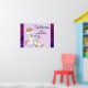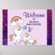 Affiche de baby shower de bienvenue. Conçu avec une licorne mama blanche avec une crinière et une queue colorées fantaisie. Un bébé licorne posé à côté d'elle, avec une sucette verte dans la bouche. Un arc-en-ciel coloré aux nuages moelleux, et quelques étoiles et coeur décorent ce design doux et adorable. Un contour rose et audacieux entourant l'image lui donne une ambiance de doodle à l'enfant. Arrière - plan de couleur pastel violet clair. Les bordures de gauche et de bord ont une fausse parties scintillant rose violet.