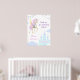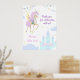 Poster d'anniversaire avec une adorable licorne avec ailes, qui est entouré de photos mignonnes d'un château magique, des nuages et des bouts festifs.