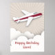 Une affiche d'anniversaire illustrant un avion blanc à rayures rouges survolant les nuages au-dessus d'un arrière - plan d'un coup de soleil. Des invitations à des fêtes d'anniversaire, des autocollants et d'autres sont disponibles à Jill's Paperie.