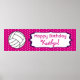 Une affiche d'anniversaire avec un arrière - plan rose avec des pois blancs. Illustration de volley-ball à gauche. Personnalisez le texte dans un cadre violet à droite.