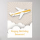 Une affiche d'anniversaire illustrant un avion blanc à rayure orange survolant les nuages au-dessus d'un arrière - plan qui a fait irruption au soleil. Des invitations à des fêtes d'anniversaire, des autocollants et d'autres sont disponibles à Jill's Paperie.