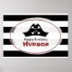 Affiche d'anniversaire illustrant l'illustration d'un casquette pirate et d'un arrière - plan rayé noir et blanc. Personnalisez le texte. Des invitations à des fêtes d'anniversaire, des autocollants et d'autres sont disponibles à Jill's Paperie.