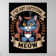 Ce graphique plein de charme et d'humour présente un chaton dessiné sophistiqué bleu et noir, assis régallement dans un fauteuil rouge moelleux. Le chat, aux yeux jaunes percés et à l'expression de contenu, est orné d'un chapeau noir élégant et d'une cravate arc rouge apper. Ci-dessus, une bannière proclame fièrement, "J'AI DE LA CATTITUDE", tandis qu'une autre bannière ci-dessous se contente de dire "MEOW". Des couronnes de laurier encadrent la scène, toutes dressées contre un arrière - plan noir solide. Téléchargement numérique pour personnel