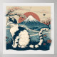 Ce poster époustouflant présente un magnifique dessin japonais d'un chat dans les tons bleu et blanc, dressé contre l'emblématique Mont Fuji en arrière - plan. L'art est plein d'ambiance avec au premier plan un mélange de bleu, rouge et blanc. Cela ferait un cadeau d'anniversaire parfait pour tout amoureux des chats ou toute personne qui apprécie l'art japonais.