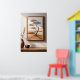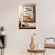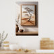 Poster d'un arbre solitaire dressé contre un paysage serein beige et marron accroché au mur. Une table en bois agrémentée d'un vase en céramique et d'un petit bol fait partie de la pièce. La lumière du soleil filtre, projetant des ombres subtiles à travers la scène.