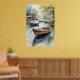 Affiche de plusieurs bateaux en bois flottant paisiblement sur une rivière calme avec des reflets des arbres environnants et des maisons sur l'eau. L'arrière - plan est doté d'une végétation luxuriante et d'une ambiance douce et brumeuse, offrant un cadre serein et tranquille.