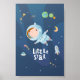L'affiche d'une petite étoile d'astronaute montre une petite fille astronaute volant dans l'espace. Texte blanc ci-dessous dit, Little Star Il y a des planètes, des vaisseaux spatiaux, des étoiles et des lunes autour d'elle. Parfait pour le mur de pépinière de votre petite étoile. Une partie de la collection Little Spaceman. Recherchez la coordination des vêtements et autres produits de décoration de pépinière.