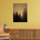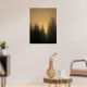 Un matin brumeux au début du mois de septembre, un lever de soleil doré illumine le fond des épinettes dans l'ombre.
