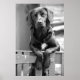 Cette belle affiche présente une photo originale d'un beau chien du labrador noir aux yeux bruns et âmes debout sur ses pattes postérieures, en plaçant ses pattes avant sur le sommet d'une porte en bois. On dirait qu'il attend patiemment que son propriétaire rentre chez lui. La photo est en noir et blanc avec seulement les beaux yeux bruns du chien en couleur. Le labrador vit dans le petit village de pêcheurs de Portmahomack dans les Highlands écossais, Écosse, Royaume-Uni, Europe.