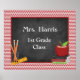 Ce design d'affiche est imprimé en chevron rouge autour de l'extérieur avec un tableau à craie à l'intérieur où vous pouvez personnaliser le nom de l'enseignant, les règles de classe ou de classe. Cette affiche a une pomme rouge, des maths, de la lecture et des livres anglais et de l'autre côté est des crayons dans un porte-monnaie debout sur une règle.