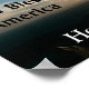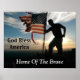 Cette affiche patriotique dit, "Dieu bénisse l'Amérique à la maison des courageux." Il montre une photo de la silhouette d'un jeune homme dans l'armée avec sa main sur un drapeau d'Amérique patinée au sommet d'une montagne. Derrière ce soldat et ce drapeau se trouve un beau coucher de soleil. Cette photo a été prise par mon fils, David Mann.