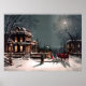 Cette image vintage de Noël montre une scène de lune enneigée tandis que les invités arrivent par cheval et traîneau pour une fête de Noël à la maison victorienne lumineuse faisant un grand poster de vacances.