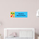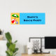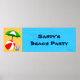 Un poster de fête ou de chambre sur mesure avec des lettres rétro bleues et l'art d'un ballon de plage, d'un parapluie de piscine et d'autres essentiels de natation ou de bronzage.