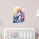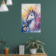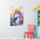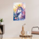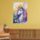 Affiche d'une licorne majestueuse avec une corne d'or entourée de fleurs vibrantes. Sa crinière coule dans des tons violets, roses et bleus, se mélangeant harmonieusement dans un décor doux et rêveur.