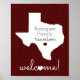 Faites savoir à toute la famille où aller pour la réunion annuelle avec ce panneau de design en forme d'état du Texas. Un espace pour le nom de votre famille et un accueil chaleureux. Disponible en rouge Tech, marron Aggie, orange brûlé Longhorn, vert Aigle, bleu royal, orange Miner et violet grenouille cornée. Personnalisable en modifiant la couleur de la forme, du coeur ou du texte de l'état. Produits correspondants disponibles, y compris les invitations.