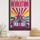 affiche de propagande de style vintage montrant deux hommes en chemise bleue tenant un drapeau rose. Derrière eux se trouve un écran de soleil arc-en-ciel. Le mot révolution est en haut de l'affiche sous une ligne d'étoiles. Éclairez un mur ou une journée d'amis avec ce design coloré de fierté.