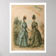 Illustration de mode vintage de deux dames du milieu à la fin des années 1800 portant de magnifiques robes bouillonnantes. Les robes animées sont en vert et bleu avec de beaux accents. Cette affiche aurait l'air magnifique encadrée et encore mieux dans un ensemble encadré de 2 - 4 illustrations.