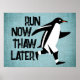 Run Now Thaw Poster motivationnel plus tard avec un mignon pingouin courant. Conception par Ellen Marcus