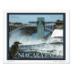 Un tableau numérique du pont international et de la tour d'observation à Niagara Falls, New York. Avec la cascade en fer à cheval qui descend rapidement dans la rivière en contrebas, elle envoie de l'eau dans l'air. Un héron de nuit bondé de noir se trouve dans le coin inférieur, à côté de la mention blanche "Niagara Falls". En haut de la peinture en lettres blanches, on trouve "Canada" et "New York", qui montrent de quel côté de la gorge se trouve qui est. Le tableau a une bordure bleu foncé. Copyright ©2023 Kimberly J Tilley.