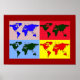 Une carte graphique du monde divisée en quatre parties avec des effets de couleurs. Une idée de couleur pour la décoration murale