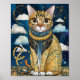 Ce dessin est une illustration stylisée d'un chat noir à la manière artistique de Gustav Klimt. Le chat est représenté en position assise, orné de motifs et de motifs de décoration complexes qui rappellent le style signature de Klimt, incorporant des formes géométriques, des éléments floraux et des motifs circulaires. L'arrière - plan dispose d'une surface dorée texturée avec feuillage stylisé et fleurs, ce qui renforce l'esthétique klimt. L'impression générale est celle d'une élégance et d'une richesse décoratives ornées, mêlant l'imagerie animale aux principes de l'art décoratif.