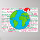 Cette affiche est imprimée d'un globe dessiné à la main et d'un casquette festif de Santa Clause. L'arrière - plan présente le dicton "Joyeux Noël" en différentes langues dont l'anglais, l'espagnol, le français, le russe, Xhosa, et plus !