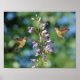 Deux beaux colibris en vol capturés avec des affiches de fleurs violettes.