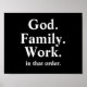 Affiche de devis de l'ordre de travail de la famille de Dieu. Affiche des priorités inspirantes et motivationnelles. Qu'est-ce qui arrive en premier dans la vie ?