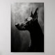 Un Doberman Pinscher noir se dresse en profil contre un arrière - plan sombre et fumé. La tête du chien est légèrement inclinée vers le haut, ses grandes oreilles perchées, et son regard orienté vers quelque chose hors caméra. L'image est tournée en noir et blanc, créant une atmosphère dramatique et mystérieuse. La fumée ajoute un sens de profondeur et d'intrigue, tandis que la silhouette du chien se distingue nettement sur le fond brumeux.