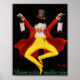 Publicité vintage d'alcool colorée et animée. Un homme chauve aux cheveux blancs avec une veste rouge, un chapeau noir et un pantalon jaune, dansant en tenant deux bouteilles d'alcool.