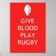 Un cadeau idéal pour les fans et les joueurs de rugby. Faite dans le style des célèbres affiches de propagande de 2ÈME GUERRE MONDIALE britannique "Keep Calm and Carry On", la couronne est remplacée par une boule de rugby et le slogan dit "Give Blood Play Rugby".