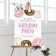 Bienvenue aux invités à votre événement avec ce signe de bienvenue personnalisable fête d'anniversaire. Il présente des beignets vernis couleur rose, blanc et chocolat avec des arroses colorées. Personnalisez ceci en ajoutant vos détails. Ce signe d'anniversaire de beigne est disponible en d'autres couleurs.