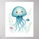 Une illustration charmante représentant une méduse bleue entourée de poissons amis et de verdure délicate. Cette œuvre d'art est parfaite pour ajouter une touche de magie sous-marine à n'importe quel espace