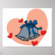 Un joli design de cloches mariages installées à l'intérieur dans un arrière - plan de coeur rose. Les cloches mariages sont côte à côte et il y a aussi quelques petits coeurs rouges autour d'elles. Ce design de cloches mariages a l'air superbe sur cette affiche