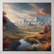 Une vallée majestueuse se déploie devant des montagnes enneigées, baignées de nuages dorés au coucher du soleil. La sérénité de la rivière qui serpente dans le paysage fusionne grandeur et paix, transformant la nature en un chef-d'oeuvre intemporel.