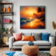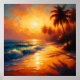 Un tableau qui capture la poésie d'un coucher de soleil tropical, où le soleil transforme le ciel et la mer en un spectacle doré. Les palmiers s'enfoncent dans les ombres orangées, et chaque vague reflète la promesse de calme, de chaleur et de possibilités infinies.