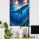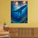 Une belle illustration sous-marine saisissante capture la majesté d'une baleine à bosse nageant paisiblement. La scène est baignée de rayons de soleil qui pénètrent la surface de l'eau, créant un jeu fascinant de lumière et d'ombre. La baleine, avec sa peau foncée tachée de taches blanches, domine le centre de l'image, entourée d'écoles de poissons de différentes tailles se déplaçant en harmonie. La partie inférieure de l'image révèle un écosystème de récifs coralliens incroyablement coloré et détaillé. Des tons vifs d'orange, de rouge, de vert et de jaune donnent vie au paysage marin, tandis que des poissons papillons et d'autres espèces de récifs nagent parmi les coraux, complétant la riche tapisserie de la vie marine.