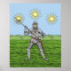 Cette illustration originale de Richard H. Fay représente Edward de York, vêtu d'un chevalier avec harnais à plaque anglaise, brandissant une poitrine médiévale tardive. Trois soleils en splendeur, symbolisant le phénomène observé le matin de la bataille de la Croix de Mortimer, brillent dans le ciel au-dessus.
