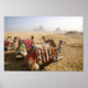 Egypte, Le Caire Des chameaux de repos regardent à travers les sables désertiques de Gizeh vers les célèbres pyramides égyptiennes à l'extérieur du Caire � Dave Bartruff / DanitaDelimont.com