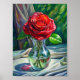 Une rose rouge éclatante fleurit gracieusement dans un vase en verre transparent, ses pétales profonds rayonnant de chaleur et de passion. La transparence du vase permet à la lumière de danser, mettant en évidence les détails délicats de la fleur. La rose est haute au milieu de feuilles verdoyants, ce qui crée un beau contraste avec la nappe argentée en dessous. La surface chatoyante de l'argent ajoute une touche d'élégance, reflétant les couleurs et rehaussant la beauté globale de l'aménagement. Cette composition dégage un sentiment de romantisme et de sophistication, invitant l'admiration et créant une ambiance sereine.