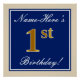 Cette affiche simple et élégante de fête d’anniversaire comporte un message personnalisé comme "Nom-Voici le 1er anniversaire!" (avec le "1er" ayant un look de couleur fausse/imitation or) dans une zone carré de couleur bleue avec un contour de bordure simple. Le nom est dans un élégant texte de couleur blanche en forme de script, et peut être personnalisé. Une affiche de fête d'anniversaire personnalisée comme celle-ci pourrait peut-être servir de décoration à une fête organisée pour quelqu'un qui célèbre son premier anniversaire. [~Z0000239]