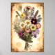 élégant délicat bouquet de fleurs pressées. Le bouquet est composé d'un mélange de fleurs sauvages, comme les marguerites, la lavande et le souffle de bébé, ainsi que de fleurs vibrantes comme des roses et des pansies, le tout parfaitement conservé avec des détails naturels. Chaque fleur a des textures complexes et des couleurs douces et défraîchies, allant des rose et jaune pastel aux violets et verts profonds. L'arrangement est établi contre un arrière - plan vieilli, parchemin, avec de subtils motifs tachés de thé et un ton sépia chaud. Le design est encadré d'une bordure en or antique ornée, rehaussant l'esthétique vintage.